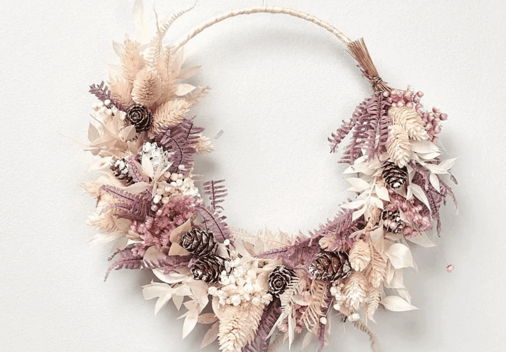 Ob Flower Hoops, Blumen- oder Saisonkränze, wir arbeiten mit Trockenblumen und natürlichen Materialien und gestalten florale Werke ganz nach euren Vorstellungen.
