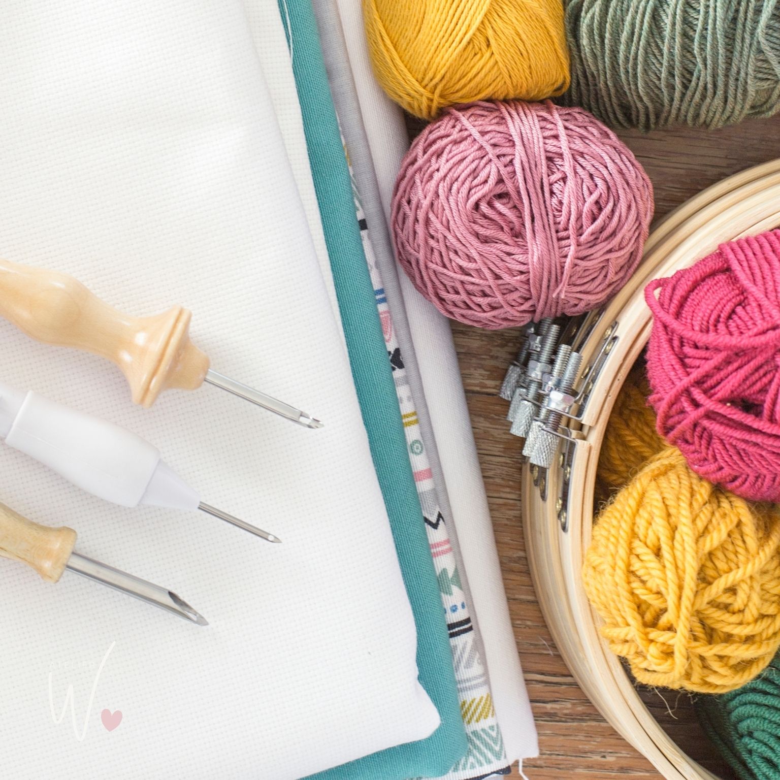 Dazu gehören Stoff, Garn, Werkzeug sowie das ausgewählte Objekt.